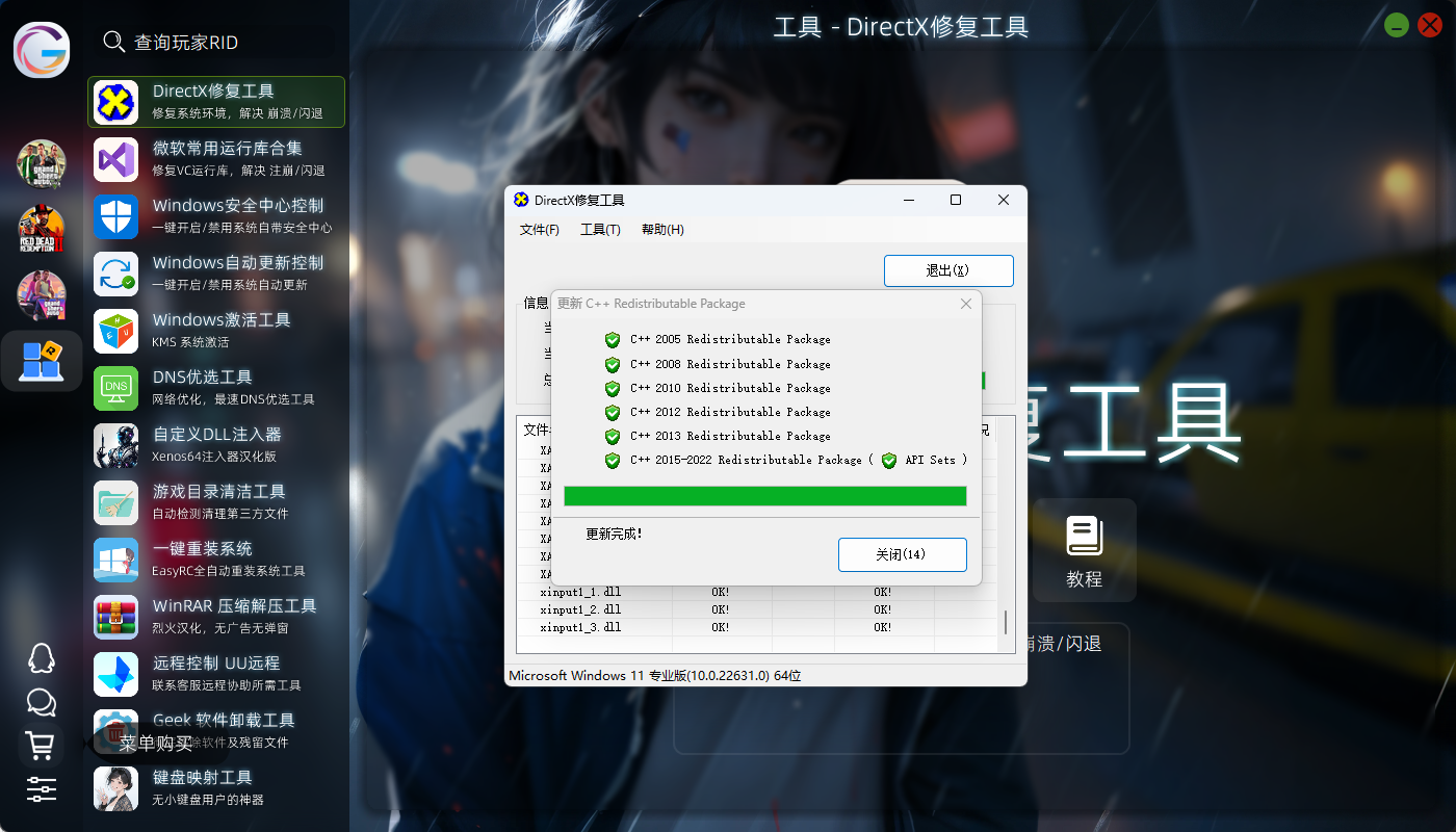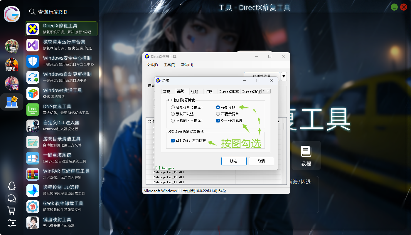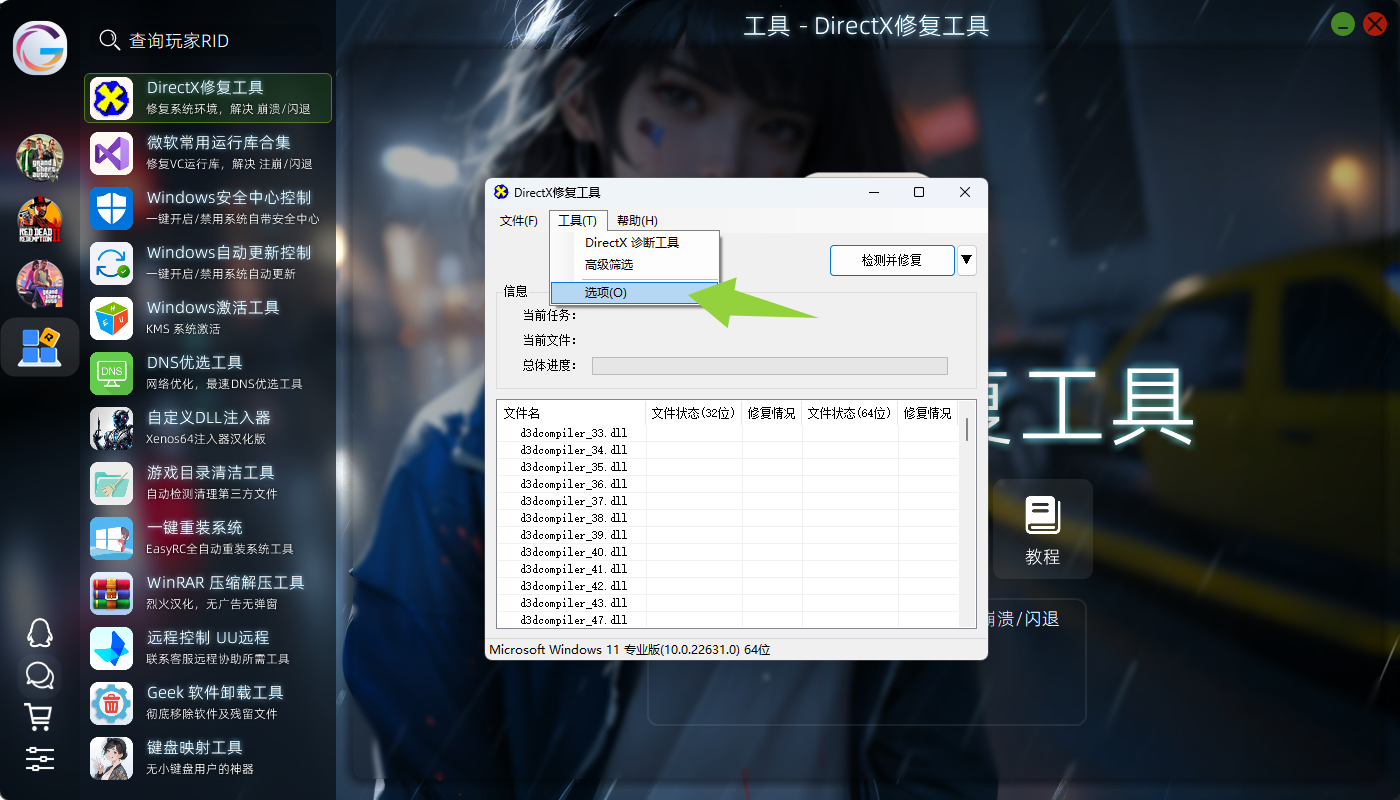 其他教程系统及其他DX修复工具使用教程本页总览DX修复工具使用教程 下载 银色安装器 银色安装器 安装器内一键安装DX增强版 信息检测修复完成每个运行库都是绿色,说明运行库是最健康状态 如果修复效果不好,先卸载所有运行库 进入控制面板-卸载程序 可按快捷键 Win+R 运行下列代码 快速进入 control appwiz.cpl 双击删除图中所有运行库之后,重启电脑,再重复上面DX修复操作! 信息如果卸载重修还是无法全部绿色合格,请测试你要开的菜单,如果问题没得到解决,请考虑重装系统,可联系银色协助!