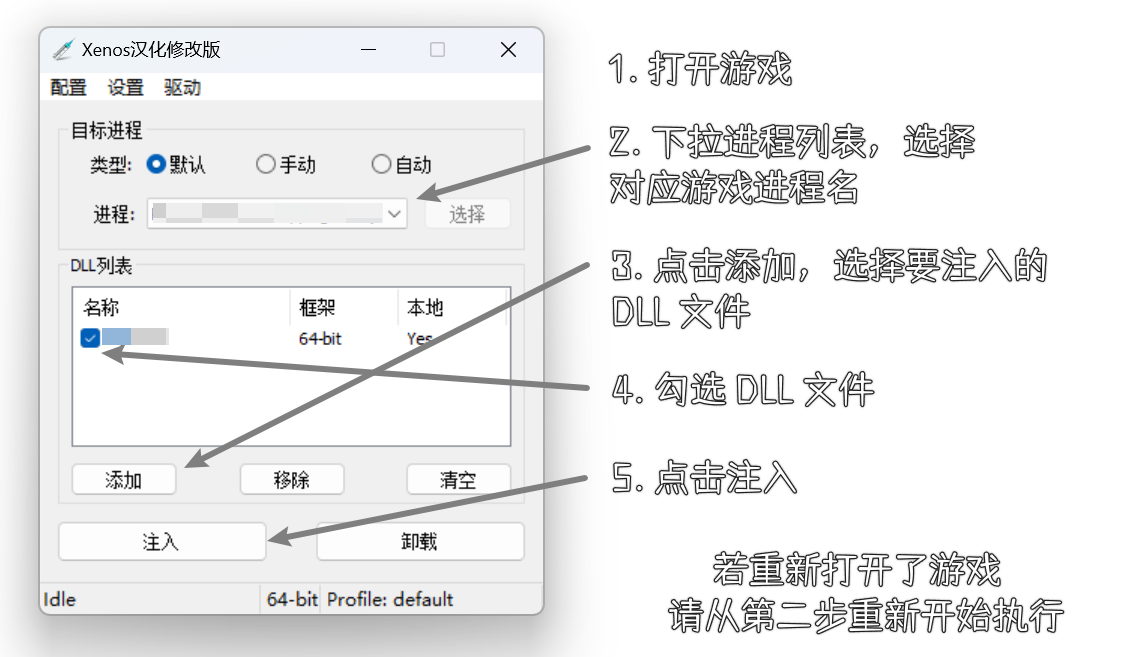 下载 Xenos 注入器汉化版,随后如下图所示