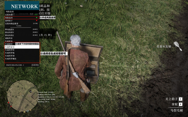 RDR2-荒野大镖客II教程FikitFikit 刷职业等级教程Fikit 刷收藏家等级教程本页总览Fikit 刷收藏家等级教程 重要提醒因作者做了限制,周卡用户无法使用循环奖励功能此功能仅支持FK永久用户使用 方法1 完成每日任务后,在FK主菜单内进入职业选项-开启循环奖励-挂机即可 (如果没完成对应的每日任务,开启循环奖励是没有效果的)方法2箱子产出1.进入创建菜单2.进入生成宝箱3.进入风险选项4.开启风险选项并生成所需的收藏品宝箱拾取方法3