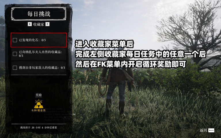 RDR2-荒野大镖客II教程FikitFikit 刷职业等级教程Fikit 刷收藏家等级教程本页总览Fikit 刷收藏家等级教程 重要提醒因作者做了限制,周卡用户无法使用循环奖励功能此功能仅支持FK永久用户使用 方法1 完成每日任务后,在FK主菜单内进入职业选项-开启循环奖励-挂机即可 (如果没完成对应的每日任务,开启循环奖励是没有效果的)方法2箱子产出1.进入创建菜单2.进入生成宝箱3.进入风险选项4.开启风险选项并生成所需的收藏品宝箱拾取方法3
