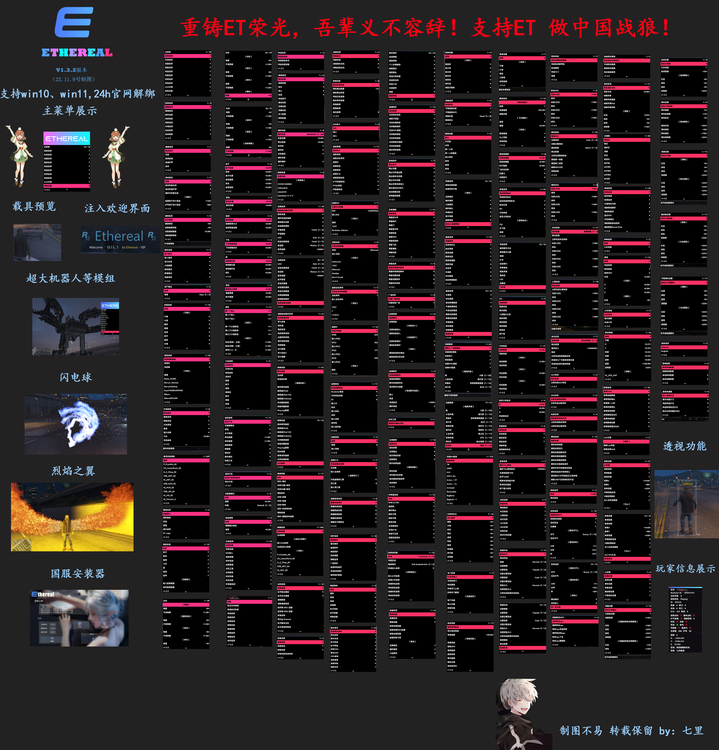 银色 截止 2022-5-8 1.0.7 版本,此菜单不支持 Epic 版本的 GTA 5,请悉知 空灵 | Ethereal 是一个国产菜单,诞生于 2022 年 上半年,主打崩溃/防崩以及任务,也在努力做 LUA 引擎 推荐对象 崩溃小子 (能崩溃很多主流菜单以及超强的防崩) 喜欢做任务,希望能跳前置改分红的 喜欢恶搞其他玩家的 (超多免费 Lua 中的功能) 喜欢国产的用户 支持系统Windows 10 / 11 (7 不确定) 价格 150 元 立即购买 其他说明 难免包含一些主观因素,评级仅供参考,三星即为满分 功能图: