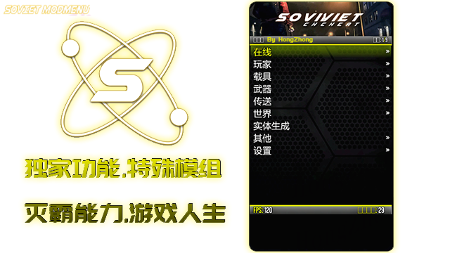 银色 1.菜单列表 2.宣传视频 点击查看https://streamja.com/RWdLQ 3.功能图 4.特色: ★★★✰✰综合评级 ★✰✰性价比优势 ★★✰防护强度[拥有20+完善的防护拦截功能] ★✰✰崩溃强度[拥两种崩溃崩溃] ★✰✰追战局支持 灭霸模组MOD:使载具/NPC浮空/使载具/NPC变动物/使载具/NPC消失/一拳超人 内含众多有趣功能:[车速表][丧尸][雷霆之剑][飞行滑板][大铁锤][墙上行走][警察帮派攻击][忍者奔跑][地爆天星]等等 钢铁侠MOD,在洛圣都里做超级英雄 众多娱乐功能,镜像世界,黑洞等 动物坐骑,可骑在动物的背上 拥有目前为止最多的修改武器枪匠后台功能数据(数百种) 拥有目前为止最多的修改载具车辆后台功能数据(数十种) 拥有众多的有趣奇特的枪子弹,如[跳舞枪][背部武器][油漆枪][挂钩锁枪][拦截枪]等等 兼容任务,做差事任务无BUG 云端配置:可在官网修改菜单配置 5.价格:220¥ 立即购买 定位:娱乐/Mod/养老 多说一句:Soviet的名字跟 [苏联/苏维埃/俄罗斯] 无关; 是根据 GTAⅣ 的主题曲:Soviet Connection 而命名的