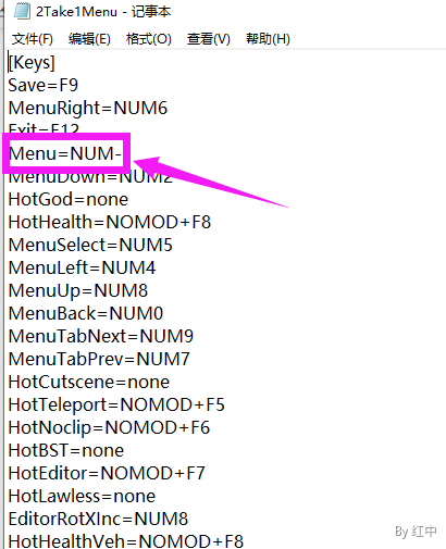 银色 按Win+R 输入 %appdata% 进入PopstarDevs文件夹 再进入2Take1Menu文件夹。里面有个2take1menu的文件。打开他。选择记事本打开 把NUM- 给改成F4就可以了。当然你也可以改成别的键位。自己喜欢哪里改哪里 想改其他的快捷键。自己这里也可以改。具体什么意思 自己可以看下快捷键对照或者自行翻译