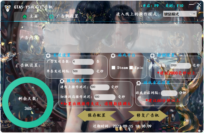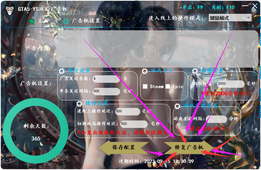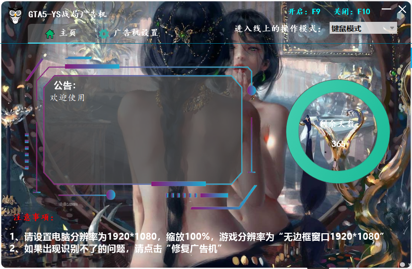如果你打开了广告机,出现运行异常的话,(比如重复自动按M之类)关游戏 点击 修复广告机 重新开就行即可