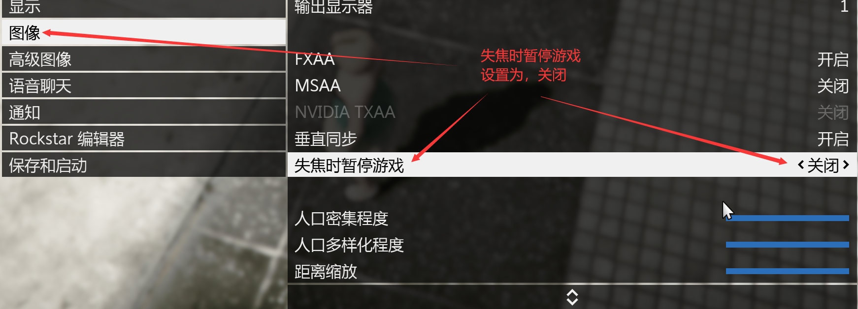 失焦时暂停游戏设置为,关闭