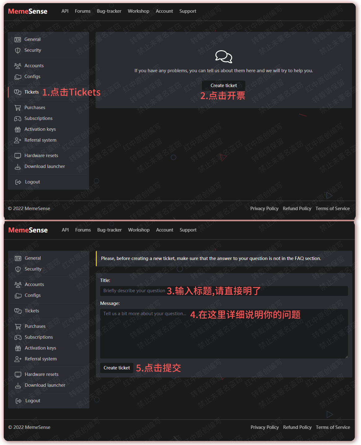 银色 MemeSense开票 进入官网并登录 MemeSense - private cheat for CS:GO 如图操作 推荐使用英文说明 标题:如果你需要解绑就写HWID RESET这样简单明了 内容:说明为什么需要解绑以及提交对应信息,比如新电脑/重装系统之类的