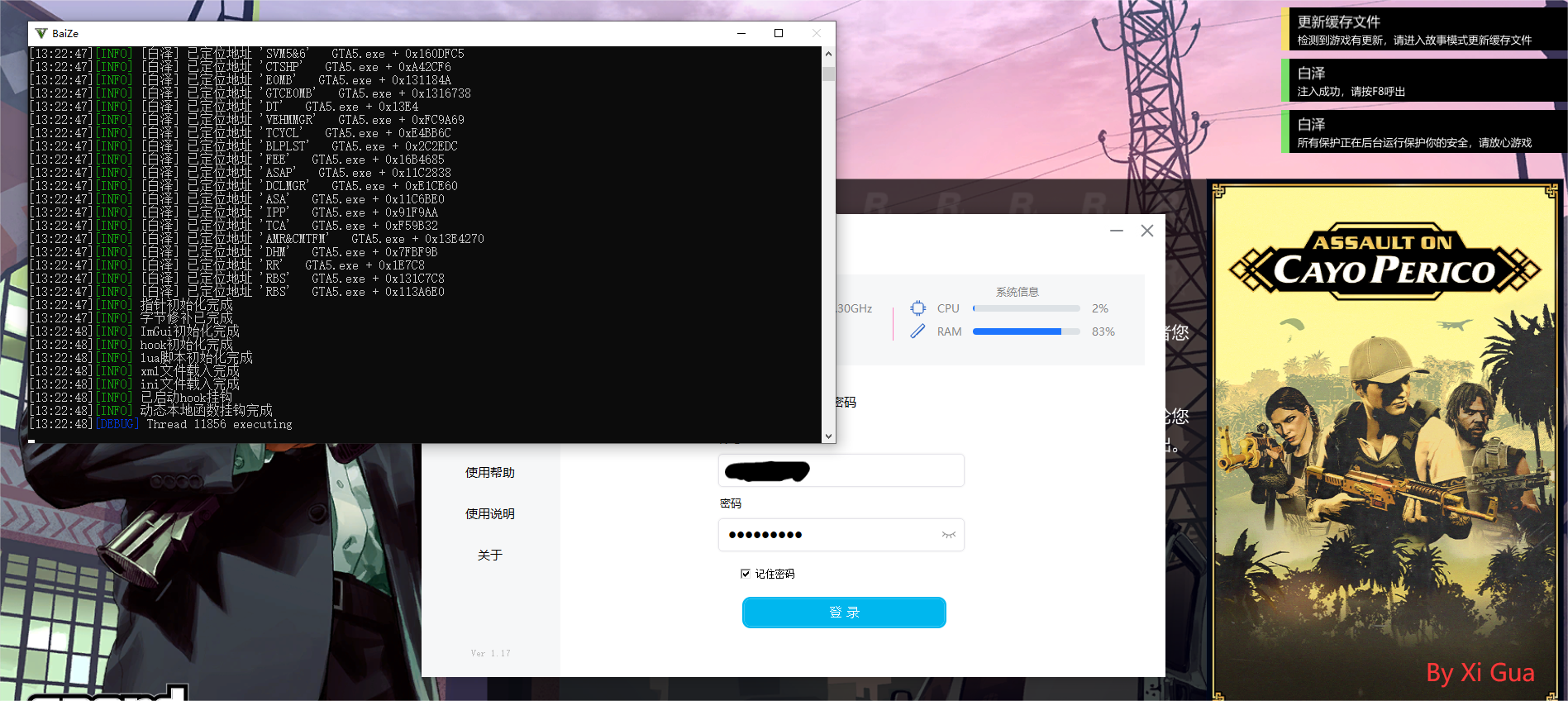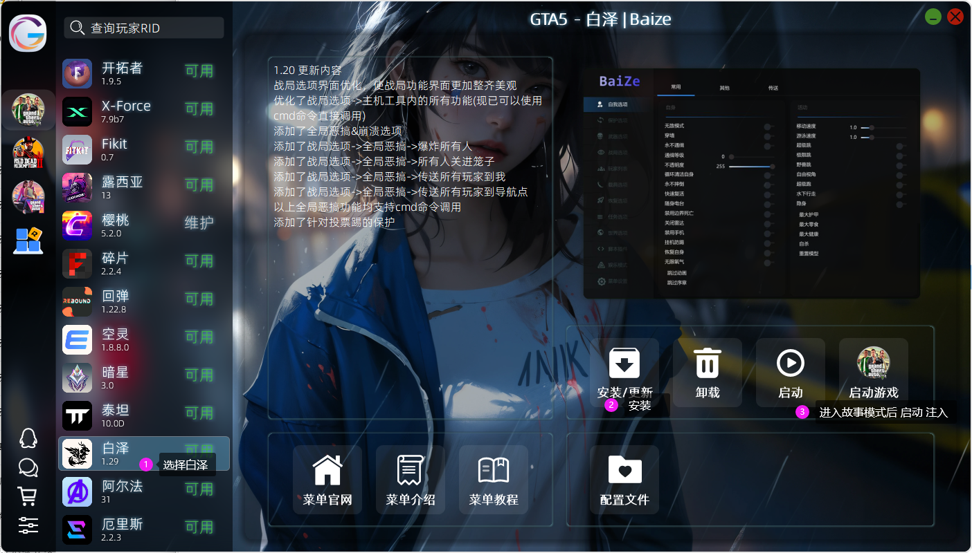 银色 下载 1.推荐使用银色安装器3.0,自动安装、更新 菜单安装器 - GTA5辅助官网-荒野大镖客2辅助官网-线上科技教程网 (yinse.wiki) 2.网盘手动下载 Spoiler: 白泽 (lanzoup.com) 下载密码:BaiZe 点击下载白泽登录器 若出现一下情况请点击保留 需要再次确认信任即可,查看一下操作 右键白泽登录器使用管理员运行 注册激活 注册时,不得使用中文符号以及中文 激活账户 激活成后,进入游戏后,点击登录 登录游戏后点击登录即可是注入 以下图片代表注入成功 使用操作:F8打开菜单/隐藏菜单 使用鼠标控制