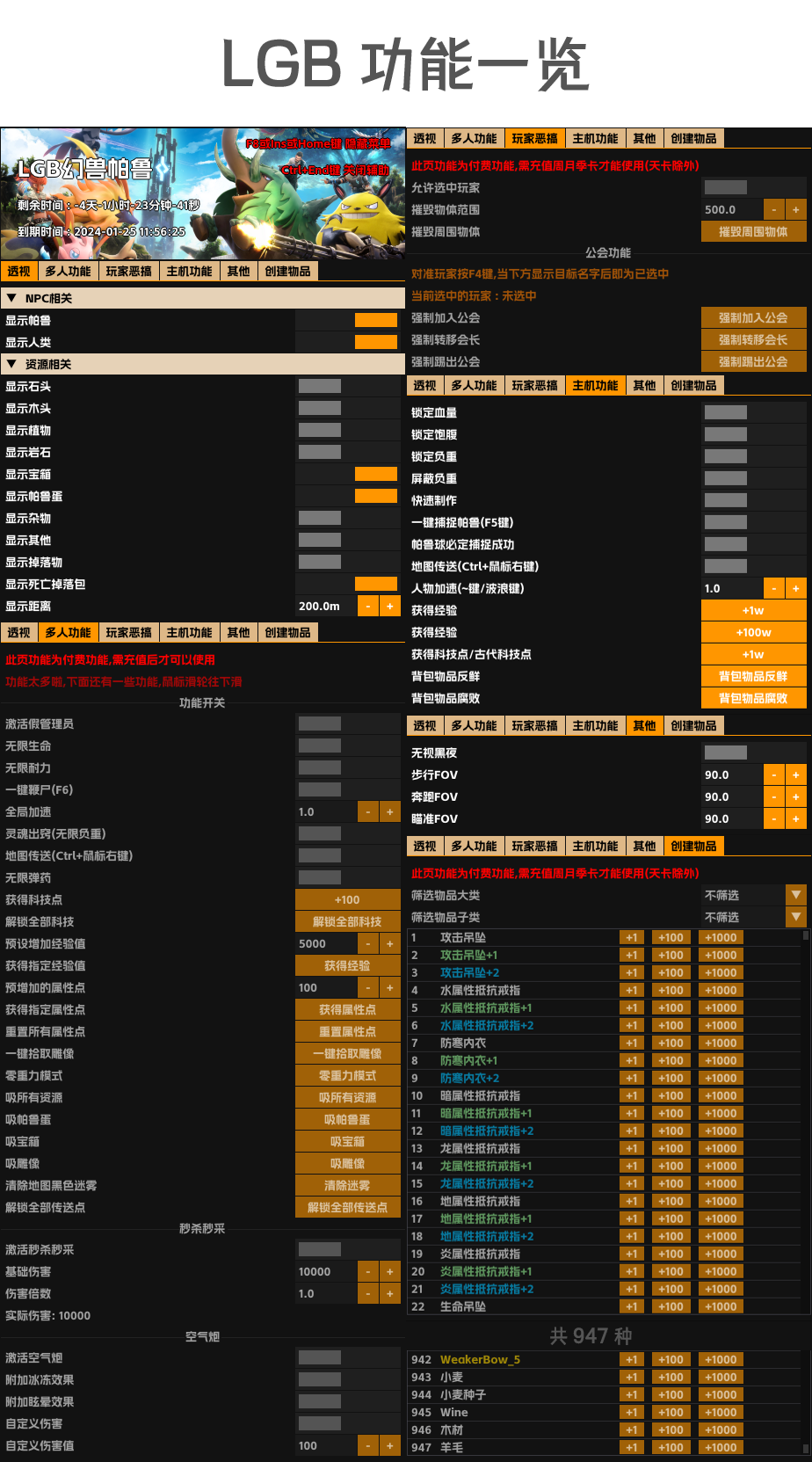 银色 主要功能:各类透视丨假管理员丨无敌丨无限体力丨鞭尸(无限掉落物)丨闪电侠丨无限负重丨地图传送丨无限弹药丨满科技点丨解锁全部科技丨一键满级丨满属性丨满雕像丨零重力丨吸所有资源/宝箱/蛋/雕像丨去地图迷雾丨解锁所有传送点丨秒杀丨秒采丨自定义空气炮(可上元素改伤害)丨(后为周卡及以上功能)丨选中玩家丨摧毁范围一切物体丨强制加入公会/转移会长/踢出工会丨凭空造物(947种)丨(未列出主机功能等其他部分,这一部分其他单机修改器也有) 此为全网功能最多的菜单,没有之一,价格全网统一,需要的尽快了 (马上更新反作弊了) · 支持所有服务器/单人 · 支持先下载使用 (确定能否用再买) · 性价比高 (功能很多) · 易上手 (从买完到使用仅需 1-2 分钟) · 更新勤快 (出现问题会及时修复) 版本区别 菜单分透视/多人功能/主机功能/其他/创建物品(支持多人) 5 个板块 其中,透视/主机功能/其他 所有人都可免费使用,不过主机功能仅限 单人游戏/你通过游戏内创建的多人官服游戏 才能使用 多人功能 仅限 天卡及以上 才能使用 创建物品(支持多人) 仅限 周卡及以上 才能使用 除了主机功能板块,其他板块功能可以在任何服务器上生效