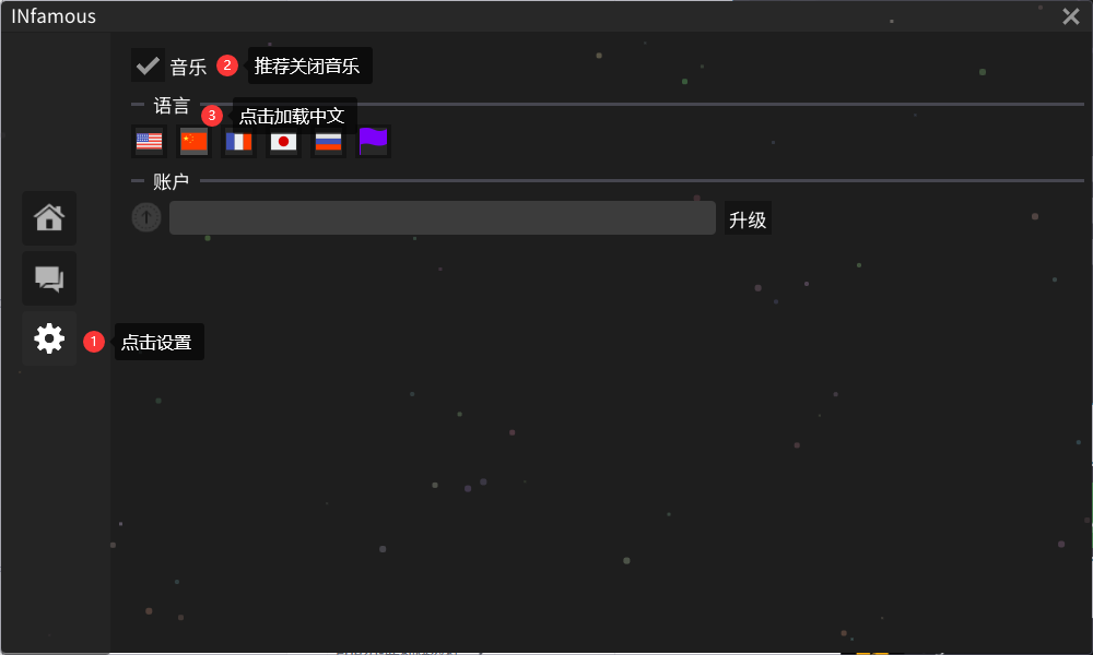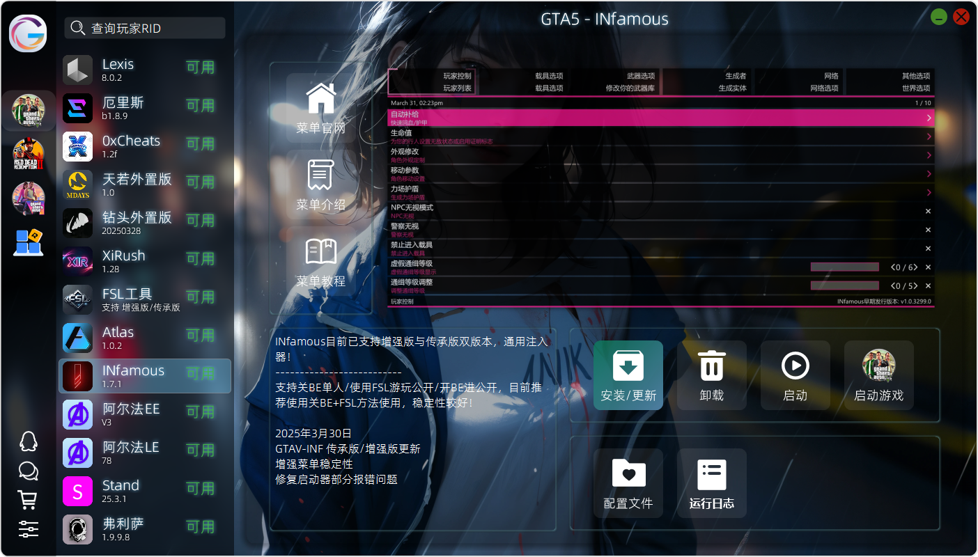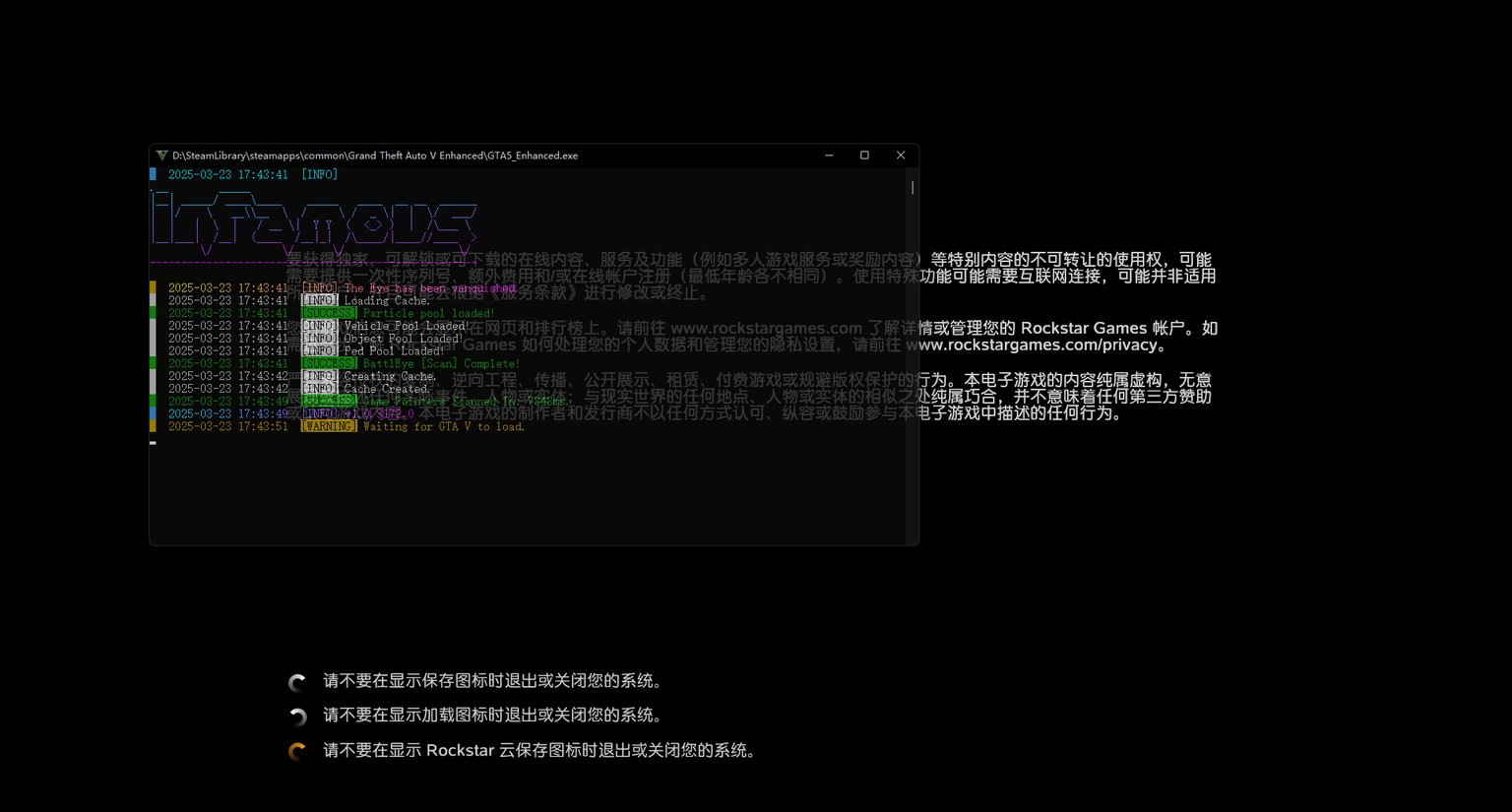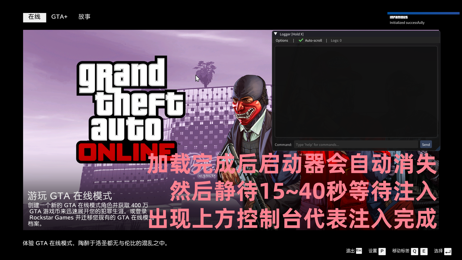 银色 前言 温馨提示 保存好自己的激活码跟注册的账号密码, 若丢失无法找回后果自负 本教程仅做正常步骤演示, 根据教程操作出现问题优先联系你的卖家解决 请仔细阅读所有内容与提示,遇到问题尝试先自己解决 (如借助 AI 工具) 教程可能具有时效性,若不适用请及时联系我 — 菜单状态 菜单状态 | 教程 Wiki 必备环境 完成 GTA5 通用设置 该菜单须保持开启BE反作弊 (打开并登录R星启动器 - 右上角设置 - 找到 BattlEye 并启用BattlEye (默认黄色,代表开启)) 关闭所有杀毒软件 (若确认已关干净请无视) / 关闭CE 等调试软件 / 关闭游戏内覆盖 (N卡/微星小飞机/游戏加加/KOOK/Oopz/Discord/ReShade等) / 卸载腾讯ACE反作弊(务必卸载,卸载后需重启电脑,如果您不玩腾讯游戏或电脑中没有ACE反作弊则无视此条),点击查看卸载腾讯ACE反作弊教程 关闭Windows内核隔离 安装 运行库合集 (下载 - 运行 - 一路继续 - 耐心等待几分钟即可,若曾安装过请无视) 运行一次 懒人脚本 (若曾运行过请无视) 下载 小贴士 永远养成一个好习惯:下载任何程序不要下到含 中文/中文符号/奇怪字符 的文件夹中,这可能导致部分程序运行不了;并建议将单个程序/压缩包放入单独的文件夹中,防止部分程序释放出很多闲杂文件或解压出太多文件影响整洁度 安装器下载 银色安装器3.0 推荐使用银色安装器,一键自动安装、自动检测更新,方便快捷 网盘下载 Infamous-注入器 注册 注册任何菜单的账号密码与游戏内的完全无关,选适合你的独一无二的好记的,不建议账号密码都输入QQ号等很容易被盗的信息 注册任何菜单最好只使用 数字 + 字母组合 , 长度在 8 位以上,尤其不要输入 中文 空格 与 中文符号 , 且极少数菜单不支持 英文符号 请自行保管好所有相关的 激活码/卡密/账号信息,请勿泄露,部分菜单没有找回密码服务,且本店没有提供相关代管业务的义务 (暂存/只是给大家的福利,请不要依赖此服务),丢失相关数据导致的任何后果自行承担 注册激活后,你账户的解释权归此软件开发团队所有,与我无关,请严格遵守规则 (部分需要我帮忙处理的比如更换机器码,属于附加福利的一种,因本店属于代购性质,请尽量自助完成),违反软件规则导致的任何后果自行承担 (如绝大部分菜单禁止分享/二手处理账户) ~ 请保管备份好自己的激活码以及账户信息,丢失之后无法找回!!我们不提供任何帐户服务! 后续网站也不会帮备份你的激活码信息,请你自行保存! 注册激活之后,该账户与我们再无关联,所有的账户信息,均由你个人单独进行维护和使用,请自觉遵守各个菜单规则! 安装器内启动 注册完成后会自动登录 请保管备份好自己的激活码以及账户信息,丢失之后无法找回!!我们不提供任何帐户服务! 后续网站也不会帮备份你的激活码信息,请你自行保存! 注册激活之后,该账户与我们再无关联,所有的账户信息,均由你个人单独进行维护和使用,请自觉遵守各个菜单规则! 手动下载安装 将文件打开并解压出来 对着所INF图标启动器 右键 - 以管理员身份运行 注册完成后会自动登录 请保管备份好自己的激活码以及账户信息,丢失之后无法找回!!我们不提供任何帐户服务! 后续网站也不会帮备份你的激活码信息,请你自行保存! 注册激活之后,该账户与我们再无关联,所有的账户信息,均由你个人单独进行维护和使用,请自觉遵守各个菜单规则! 首次激活可能只有增强版,大约会在3-4小时会自动激活传承版 注册完成后会自动登录 请保管备份好自己的激活码以及账户信息,丢失之后无法找回!!我们不提供任何帐户服务! 后续网站也不会帮备份你的激活码信息,请你自行保存! 注册激活之后,该账户与我们再无关联,所有的账户信息,均由你个人单独进行维护和使用,请自觉遵守各个菜单规则! 注入 注册成功后会自动登录 如果没自动登录请如下图操作,输入刚注册的 账号 密码 点击登录即可 启动器内可左键+右键拖动菜单列表选择您购买的版本 GTAV Enhanced - Edition-Tester为增强版开BE GTAV Enhanced - Full+Edition为增强版关BE GTAV Legacy - Full+Edition为传承版 增强版开BE注入 先开启GTAV增强版游戏,保持游戏为运行状态 然后依下图操作 增强版关BE注入 关BE教程与FSL插件说明👇 什么是BE?什么是FSL?老玩家回归必看,快速了解! 关闭BE教程、借助FSL补丁进入线上教程: https://www.yinse.wiki/d/709(复制到浏览器访问) 点击注入后,开始转圈,请耐心等待至右下角出现等待游戏,请启动游戏/Waiting For Game! 出现等待游戏,请启动游戏/Waiting For Game!提示后开启游戏即可 启动游戏后会自动注入,等待程序框 直至控制台内出现Waiting for GTA V to load后即可进入故事模式/线上模式 传承版注入 先开启GTAV传承版游戏,保持游戏为运行状态 然后依下图操作 如若注入失败 查看以下教程,注入成功无视此条. 菜单注入崩溃/游戏闪退,系统运行环境有问题,解决方法:【所有菜单通用】 使用 F4 呼出/隐藏菜单 支持键盘/鼠标控制 鼠标点击,或: 方向键↑ ↓ 或者8 2 控制上下 方向键← → 或者4 6 控制左右 回车键/Ent/5 确定; 退格键/Back/0 返回 设置中文 注入成功后如图操作: Settings→Translations→Chinese 注意事项 如果你使用完菜单,想玩其他游戏,必须先重启电脑再玩!否则后果自负!