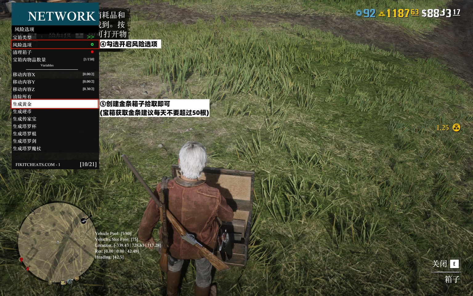 银色 FK刷金条美金教程 方法1-循环奖励 因作者做了限制,周卡用户无法使用循环奖励功能 此功能仅支持FK永久卡用户使用 周卡用户可下拉查看方法2 通过宝箱获取 完成每日任务后,在FK主菜单内进入职业选项-开启循环奖励-挂机即可 (如果没完成对应的每日任务,开启循环奖励是没有效果的) 方法2-箱子产出 1.进入创建菜单 2.进入生成宝箱 3.进入风险选项 金条产出教程: 4.开启风险选项并生成所需的收藏品宝箱拾取 美金产出教程: 4.进入其他宝箱 选择5.0美元 并设置数量创建即可